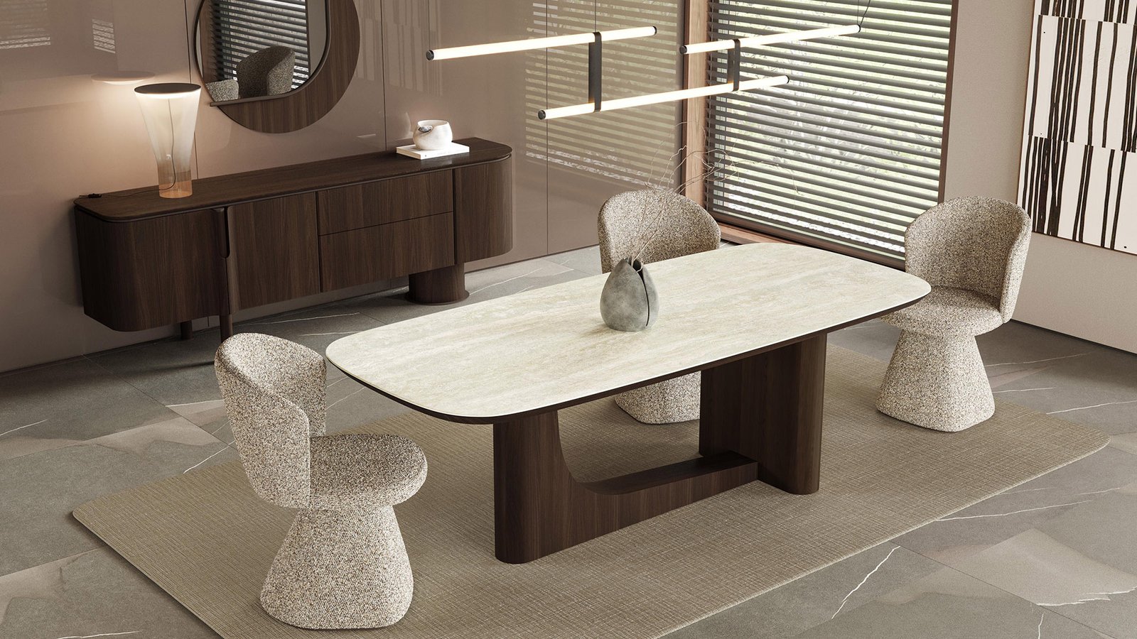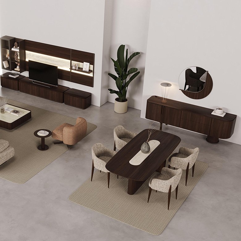 Foresta Yemek Odası, koyu kahve meşe kaplama ve çizilmesi zor porselen detaylarıyla estetik ve dayanıklılığı bir araya getirir. Zarif tasarımı, her yemek anını şıklık ve fonksiyonellikle taçlandırır.